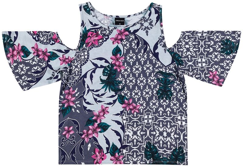 Blusa Feminina Adulto Cereja Rosa de Viscose Estampada Ombro Vazado Manga 3/4