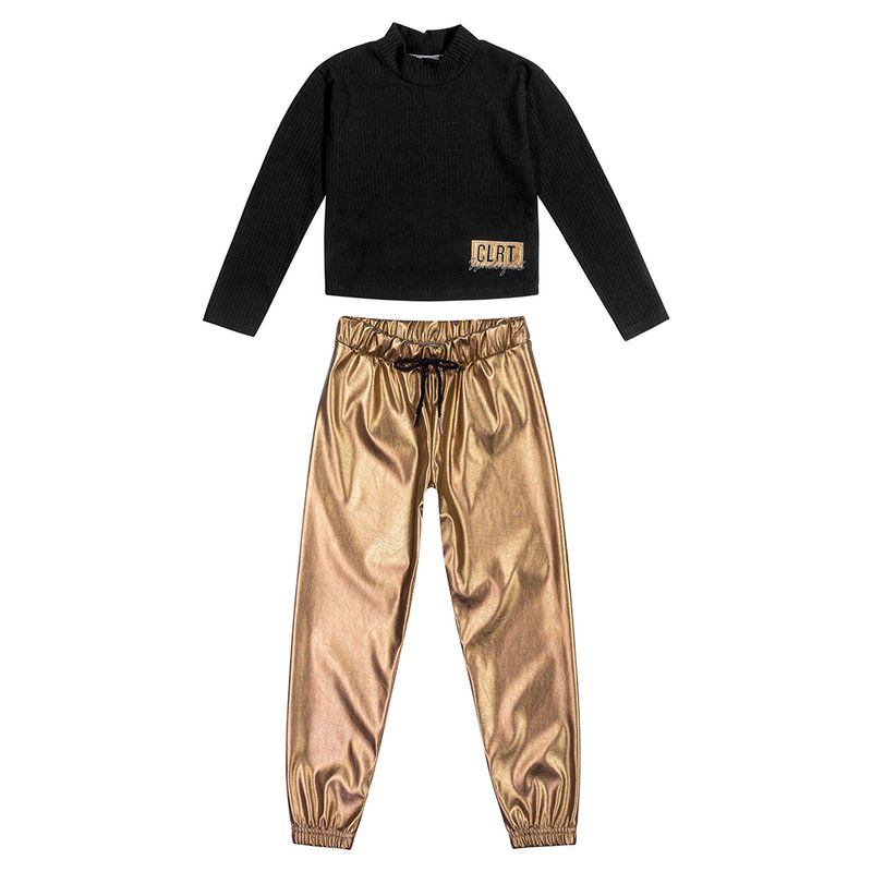 Conjunto Blusa e Calça Feminino Juvenil Coloritta em Malha Canelada e Courino Acetinado