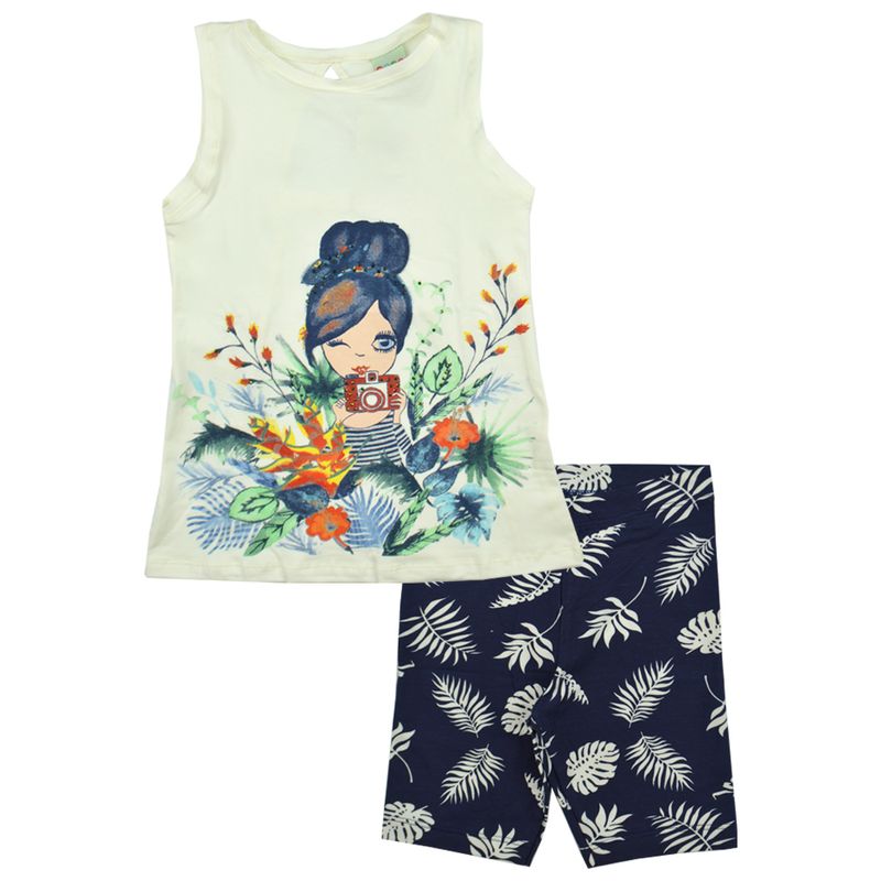 Conjunto Blusa e Ciclista Feminino Juvenil Have Fun em Cotton Estampada Folhas