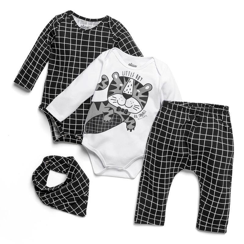 Conjunto Body, Babador e Calça Saruel de Menino Bebê Elian em Cotton Leve