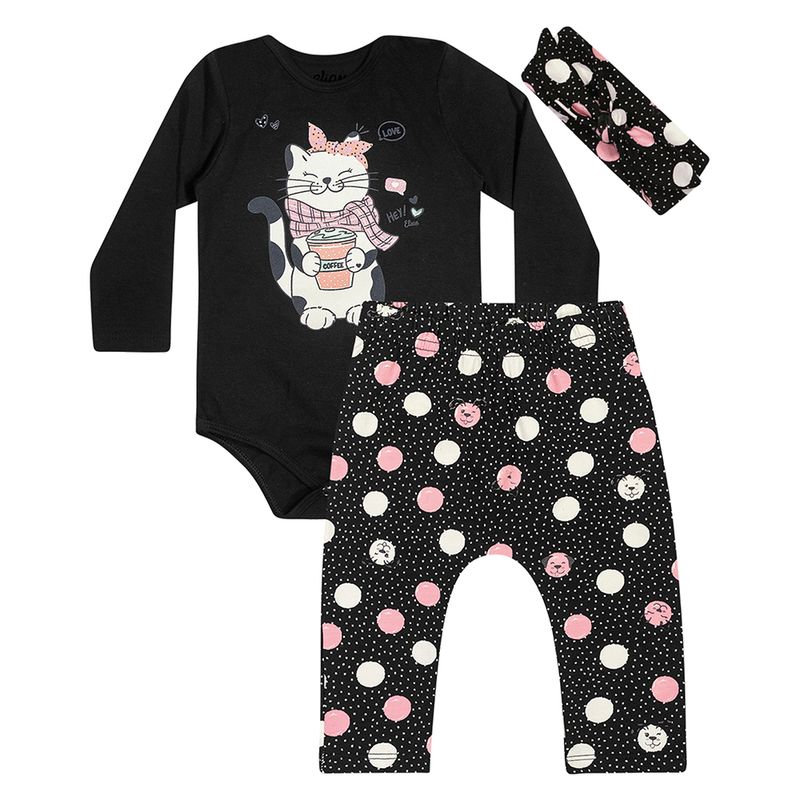 Conjunto Body, Calça Saruel e Faixa Gatinha Bebê em Cotton Leve