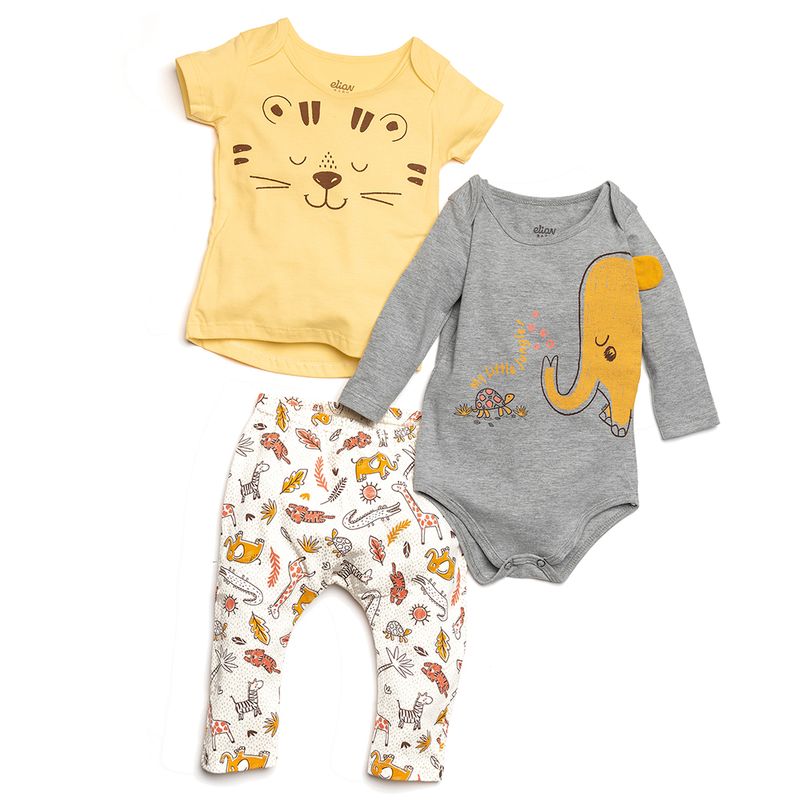 Conjunto Camiseta, Body e Calça de Unissex Bebê Elian em Meia Malha Penteada e Cotton Leve