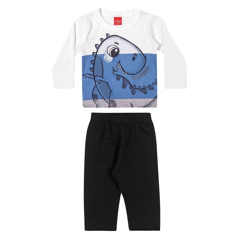 Conjunto Camiseta Dinossauro e Calça de Menino Bebê Elian em Meia Malha Penteada e Moletom sem Felpa