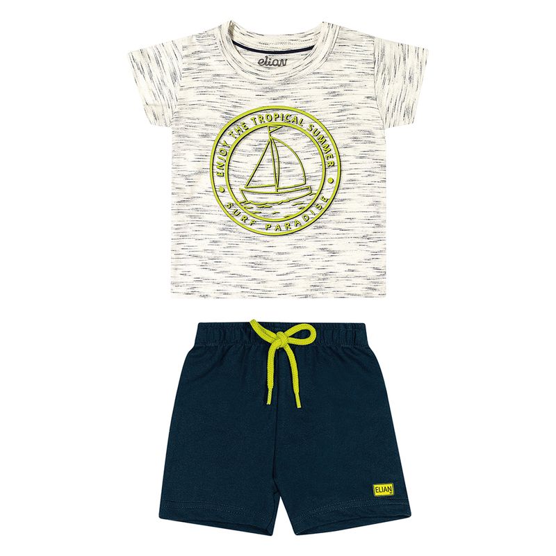 Conjunto Camiseta e Bermuda de Menino Bebê Elian em Meia Malha Penteada e Moletinho