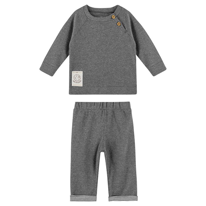 Conjunto Camiseta em Malha Tricô Texturizada e Calça Dupla Face em Malha Tricô Texturizada e Malha Listrada Eco Bebê Colorittá