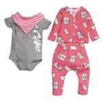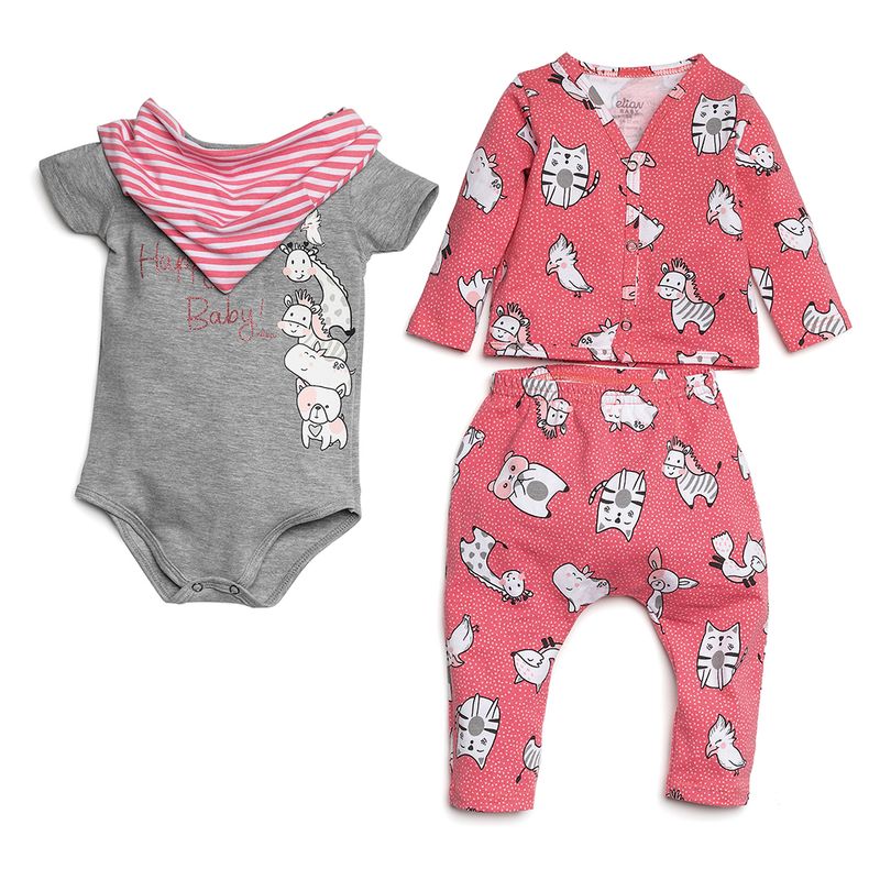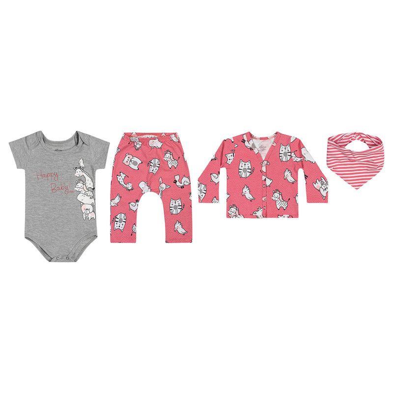 Conjunto Casaco, Body, Calça e Babador de Menina Bebê Elian em Cotton Leve