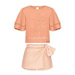Conjunto Femininno Infantil Alakazoo 0085 Material: MALHA NEW YORK E MALHA SWEET Manga: MANGA CURTA Abertura: FECHADA Aplique Strass Detalhe com Renda na Manga Shorts Saia Material: MALHA Manga: MANGA CURTA Barra: Abertura: FECHADA