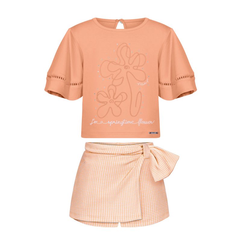 Conjunto Femininno Primeiros Passos Alakazoo 0085 Material: MALHA NEW YORK E MALHA SWEET Manga: MANGA CURTA Abertura: FECHADA Aplique Strass Detalhe com Renda na Manga Shorts Saia