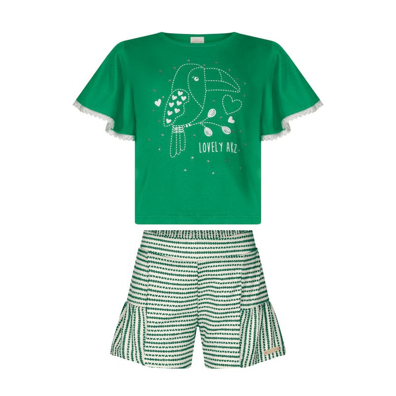 Conjunto Feminino Infantil Alakazoo 0082 Material: MEIA MALHA PENTEADA E MALHA NIKKO Manga: MANGA CURTA Abertura: FECHADA Aplique de Pompom e Strass