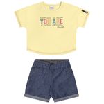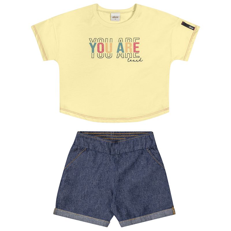 Conjunto Feminino Juvenil Elian 251781 Material: MEIA MALHA PENTEADA E JEANS Manga: MANGA CURTA Abertura: FECHADA Estampa com Glitter