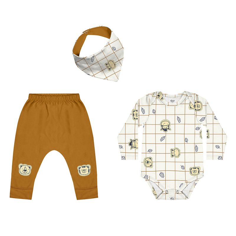 Conjunto Masculino Bebê Elian 201283 Material: COTTON LEVE Manga: MANGA LONGA SEM PUNHO Barra: BARRA TRADICIONAL Abertura: BOTAO Acompanha Bandana Estampa com Puff