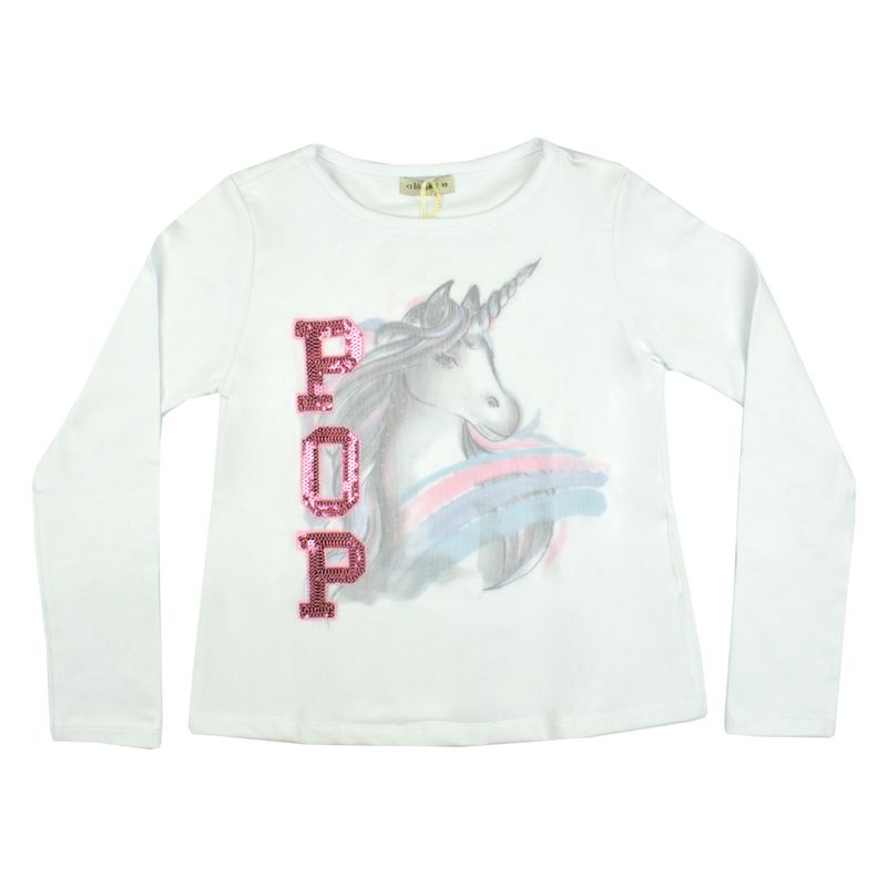 Conjunto Unicórnio Feminino Juvenil Lilysky: blusinha de Malha com Estampa de Unicórnio com Strass e Tule Escrito Pop em Lantejoula e Shorts Jeans Claro