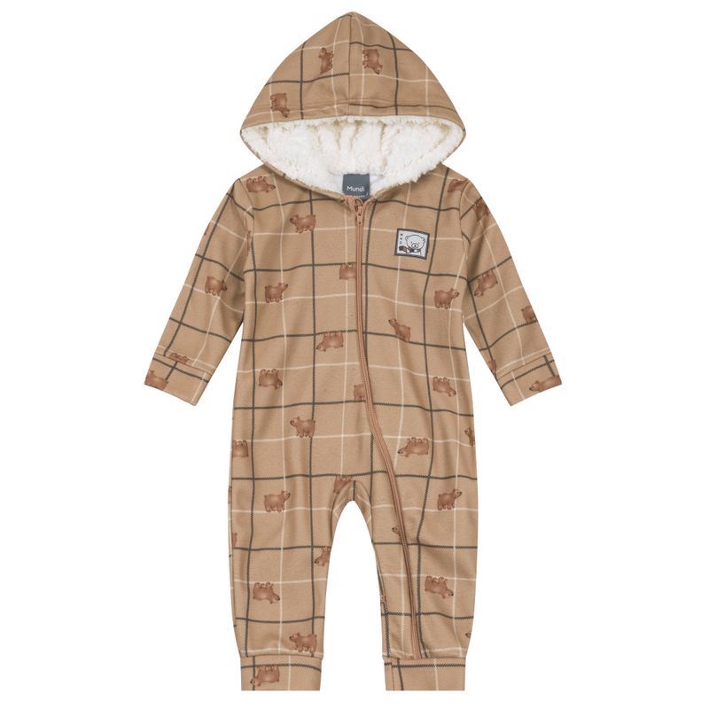 Macacão Masculino Bebê Mundi 55327 Material: MALHA/ PELO Manga: MANGA LONGA COM PUNHO Abertura: ZIPER Capuz Forrado Aplique Termocolante