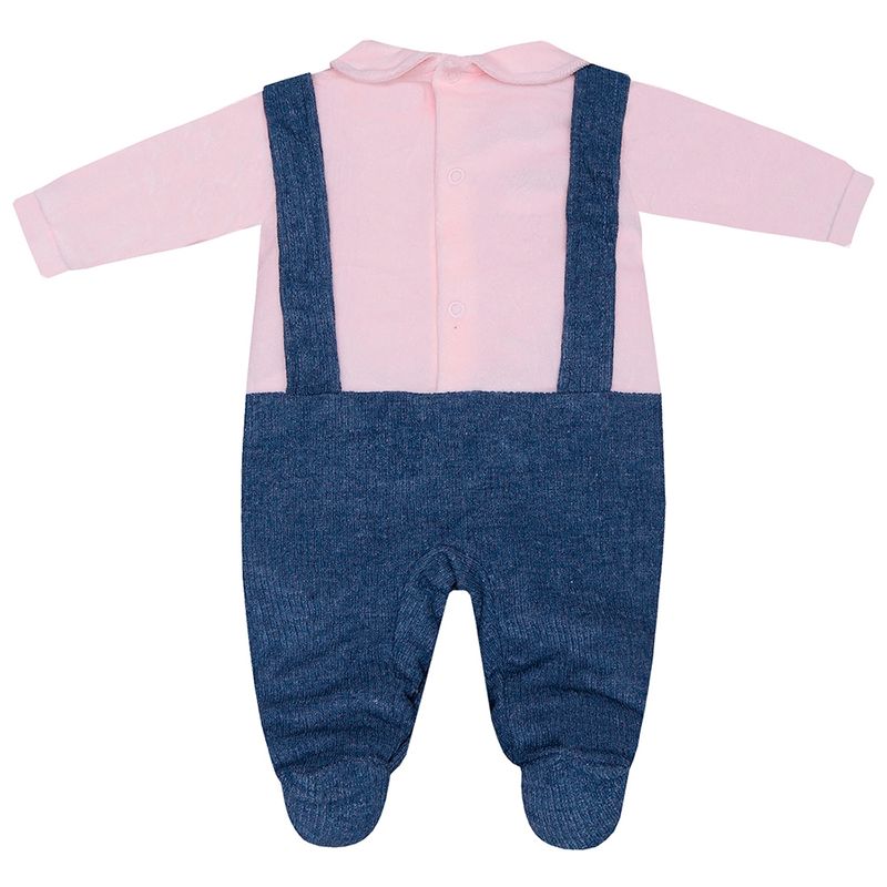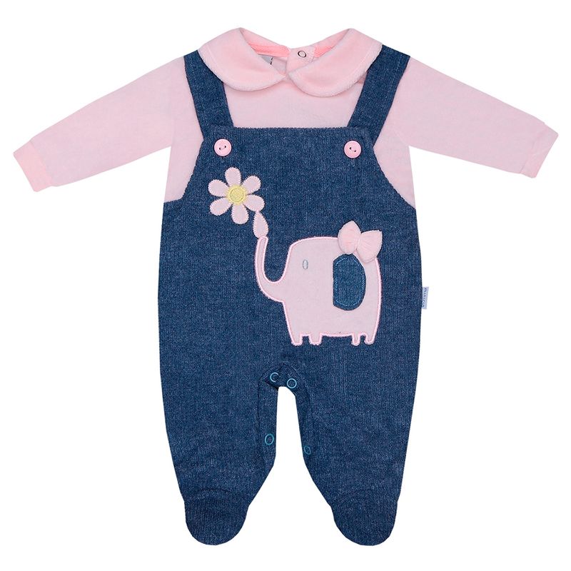 Imitando uma jardineira o macacão tem gola boneca, aplicação de elefante na parte frontal, detalhes em botões nas alças e fechamento vertical traseiro/gancho em tic.