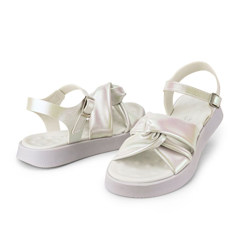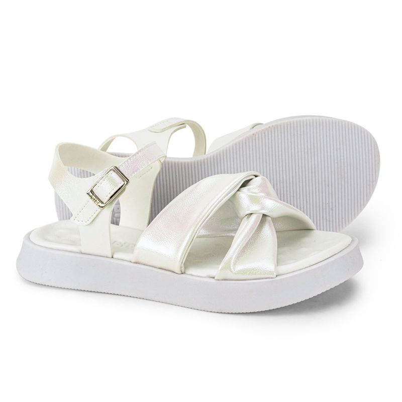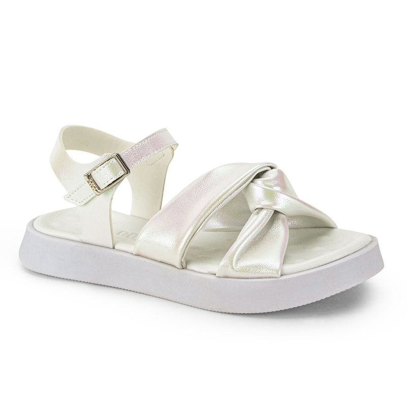 O fechamento é feito com uma nova fivela de calce fácil, sem pino, para facilitar o ajuste e garantir um encaixe perfeito nos pés das pequenas.